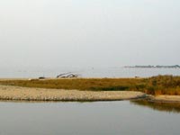 対岸に大きな流木を見つけてレンズを向けてみたが、目で見ないと大きさは分かりませんね。手前の水面は川、奥の水面は海ですが、凪だった上に曇っているので水平線が一体どこにあるのやら。