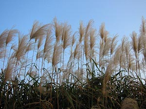 随分移動しました。コレはススキ。俺の背よりも高く育って、見上げる格好です。周囲にクモの巣があったりするので要注意の場所でもあります。道を挟んで、海まで15mほどでしょうか。これも塩は平気のようです。隣に生えていたセイタカアワダチソウは茶色になって半ば枯れ、見るにたえませんでした。満月の夜半にここを通ると、月がススキの間から見えてそれはそれは美しいのです。